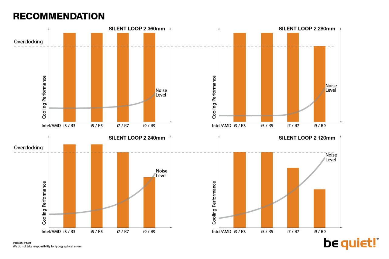 The closest to a concrete guideline I could find was the infographic in Figure 3 provided by Be quiet! on their Silent Loop 2 cooler’s web page11. The graph shows the performance and noise level of different sizes of the Silent Loop 2 cooler when coupled with different tiers of processors. As no units are given on the y-axis, no concrete information can be extracted from the graphs. However, it seems clear that a 280mm cooler is viewed as the minimum for a Ryzen 9 processor, with a 360mm seemingly being recommended. I was able to confirm this impression by analyzing multiple other computer builds online.