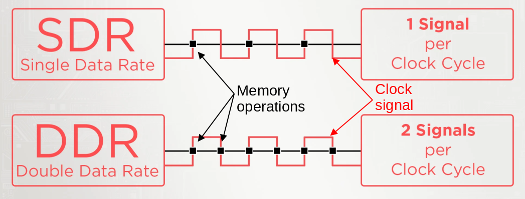 - Double Data Rate: This means that, memory operations occur twice per clock cycle, on both the rising and falling edges of the clock signal. This contrasts with Single Data Rate memory where such operations occur only once per cycle, either always on the rising or always on the falling edges. Figure 14 illustrates this difference.