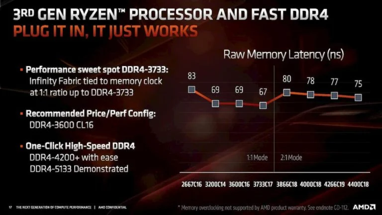 Each of these three components has its own clock signal, and as such exists in a separate clock domain7. However, for optimal operation all three need to run at the same frequency, this is referred to as 1:1 mode (sometimes also as 1:1:1 mode). Default motherboard BIOS settings make it so that these three components are automatically synced to run at the same frequency. However, this mode is maintainable only up to memory transfer rates of 3600MHz89 (i.e. an effective memory clock of 1800MHz). Passed this point, the Infinity Fabric’s clock is decoupled from memory clock, and remains set at 1800MHz. Additionally, the Unified Memory Controller’s frequency drops to half that of the DRAM module910. This is referred to as 1:2 mode (confusingly, it is also sometimes referred to as 2:1 mode). Because the three components run at different clock frequencies in this mode, a synchronization between their different frequency domains is required whenever data is transferred from one domain to the other. This synchronization incurs a penalty in the raw memory latency.