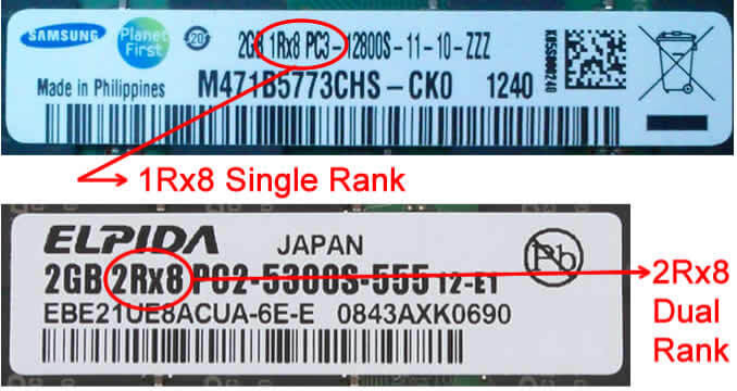 One finally thing to add concerning memory rank is that, the rank of a memory module is usually communicated by vendors using the notation: NR, where N is the rank (e.g. a 16GB 2Rx4 memory module, has a total 16GB capacity organized into two ranks of 4-bit wide DRAM chips). Figure 817 shows two memory labels displaying rank information using this notation. The labels Figure 8 also include information about the width of the used DRAM chips using the xN notation we mentioned earlier.
