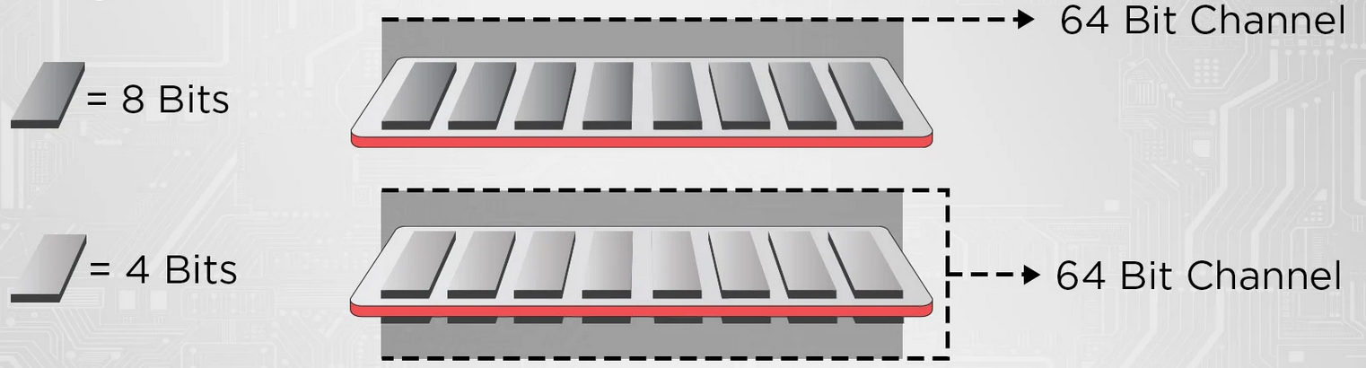 A memory module (or stick), is a simple PCB which hosts DRAM chips. These memory chips are the building blocks of RAM and are characterized by their width (in bits) and their size/density (in Gbits). Current consumer market DRAM chips can have a width of 4, 8, or 16 bits, and sizes ranging from 1Gbit all the way to 16Gbits16. The width of a DRAM chip is usually expressed using the form xN, where N is the width in bits, e.g. a 1Gbit x4 chip is a DRAM chip with a capacity of 1Gbits, and a width of 4 bits.