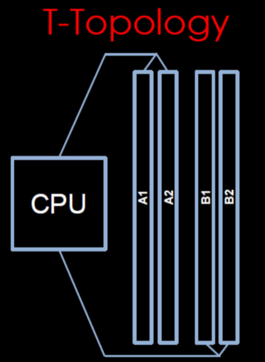 This topology clearly favors four memory sticks being connected. In the case where only two sticks are connected (one on every channel), the open-ended wire-endings on the empty branch of the topology will cause signal reflections to occur on the channel traces, thus deteriorating the signal quality on the populated branch. This results in a drop in the maximum frequency achievable on the channel, thus limiting the maximum attainable memory bandwidth.