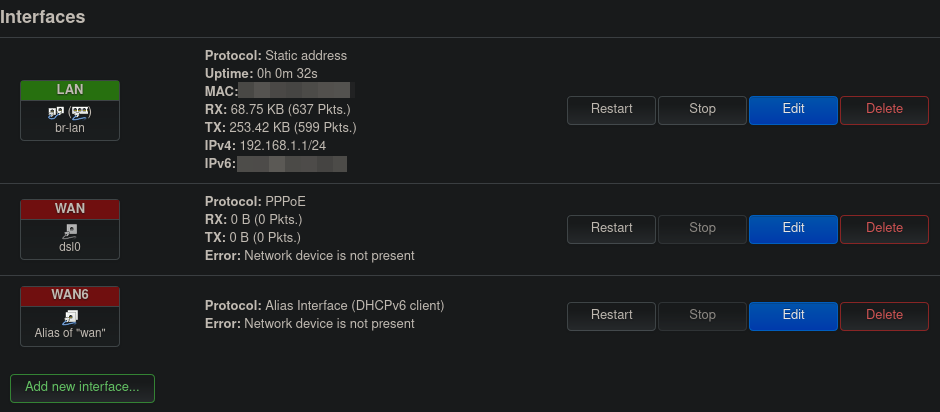 WANandWAN6interfaces and replaced them with a newly createdWANinterface which has the following settings:- Device: