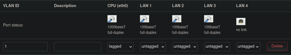 CPU (eth0)port, does not correspond to any physical port, but is a logical representation of the communication interface between the router’s CPU and the onboard switch. - There already exists a VLAN set by default by OpenWrt. This VLAN has the ID