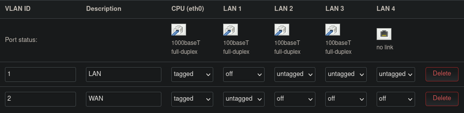 LAN1is set to be off forVLAN1and untagged for forVLAN2. This is because we don’t need whatever device we will be connecting on theLAN1port (in this case the ISP router) to be aware of its VLAN ID. - The