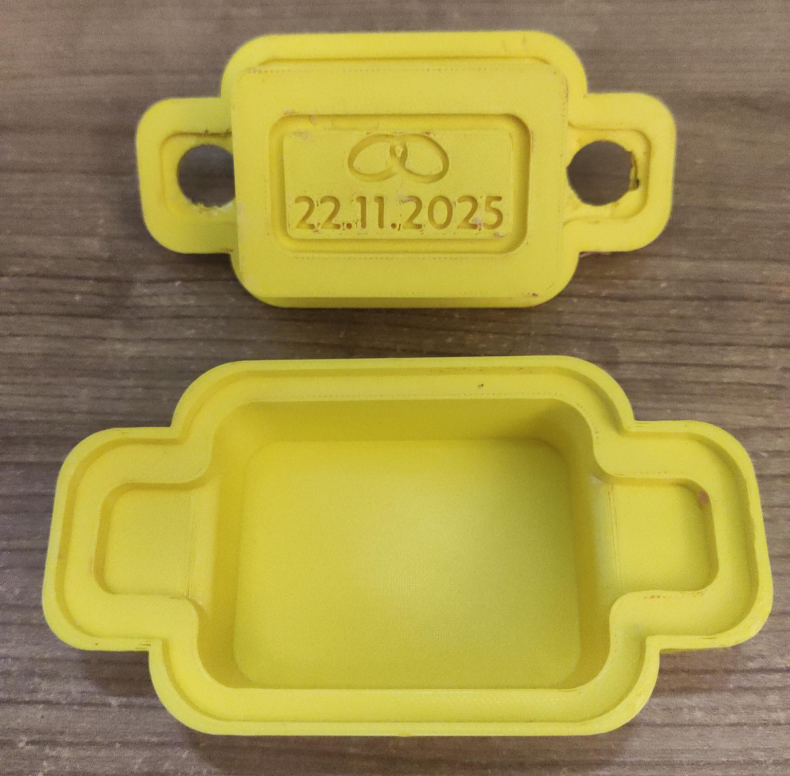 One change which we thought would make the gift much more personal, was to replace the “you” and “me” in the original design with our names. - A handmade soap bar that would be engraved with the date of our wedding. Here again, the idea was for me to make the molds that would leave the imprints on the bars of soap, and for my wife to make the soap itself.