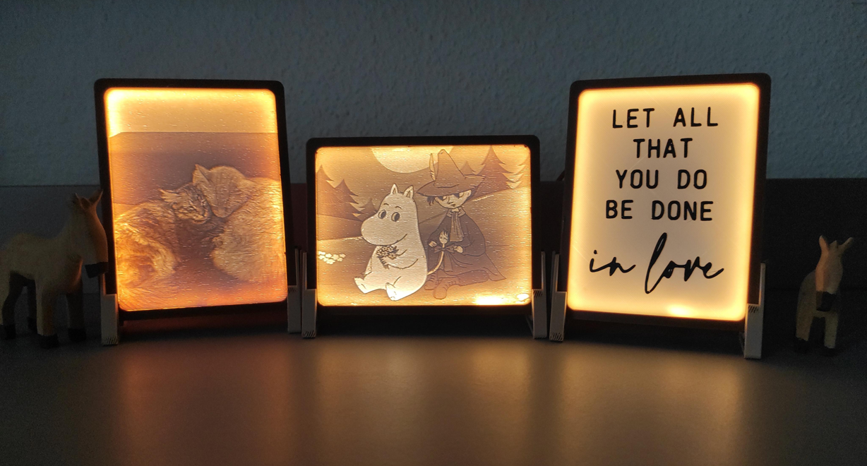 Figure 13 shows the assembled lamp in use. All in all, I think the result did not turn out bad at all. I really like the fact that it does not require any additional tools or components to be assembled. Its ease of print has been a godsend after the umpteenth hour of printing. Furthermore, its modularity allows for the front panel to be easily switched for a custom design. Finally, tweaking the model into landscape mode in addition to the portrait mode design I had decided on was straight forward. Figure 14 shows some of the different front panels I made using online lithophane generators. I have also uploaded the designs to my Printables profile.