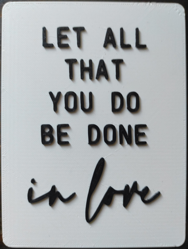 Funnily enough, this simpler design came with a lot of unexpected benefits. First of all, whereas the details of the original lithophane plate I had in mind would have only been visible during the night when the lamp would be turned on, the black text of the final design was clearly readable in the light of day, making it possible to use the lamp as decoration during the day when it would be turned off. Additionally, because there were no more fine details in the final plate, I could rest assured that the quality of my prints would remain consistent across the one hundred units I was to make. Finally, the plate could now be much thinner than required by a lithophane design. In fact, I found that a thickness of 2mm for the plate itself and 1mm to 2mm height for the text achieved a very satisfactory light diffusion effect. The text in question I ended up settling on is quote which my wife and I both agreed would be a great reminder of our special day.