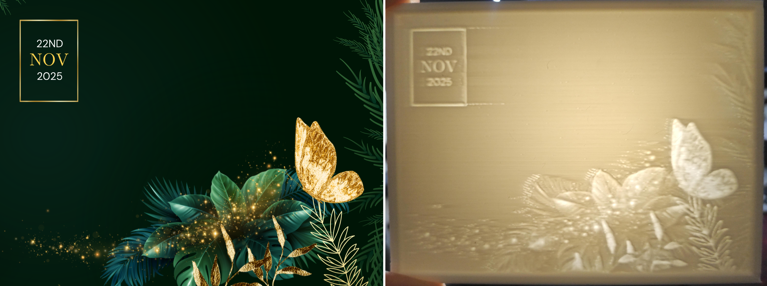 I will get to my design of the frame in a bit, but before that, I would like to introduce the iterations the front plate went through. As I mentioned when I first introduced the gifts, the idea was to use the invitation design as a starting point, simplify it a bit (e.g. removing most of the text), and feed the resulting image into a lithophane generating program (e.g. ItsLitho.com).