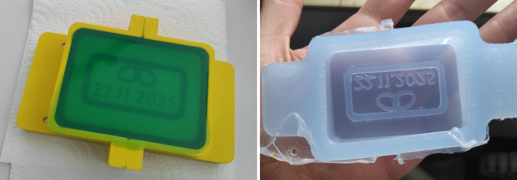 - The second issue was that some of the finer details of the imprint were not reproduced in the cured silicone. I believed this issue was due to the imprinted face of the “inner” piece of the mold having been designed to be facing down. In such design, the viscosity of the silicone would act against the silicone rising into the smaller pockets in the imprint and filling them as expected.