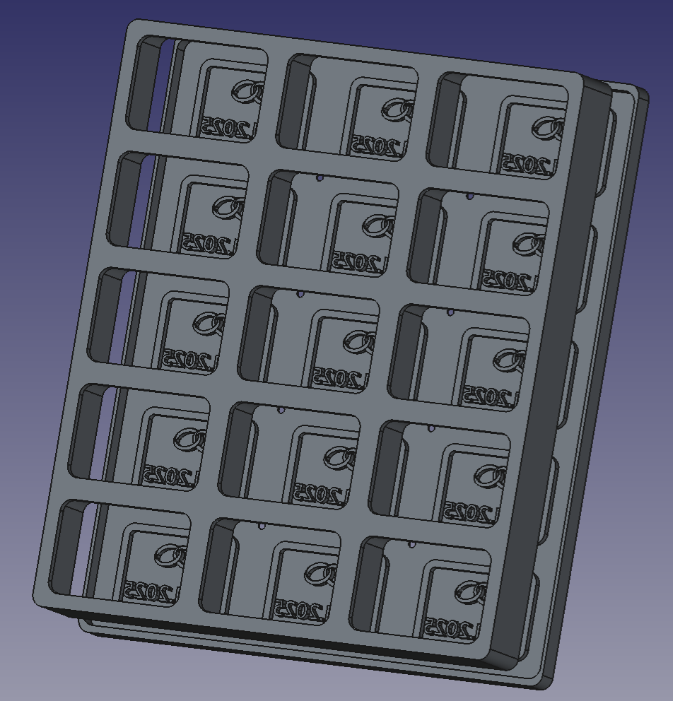 The design of the hardshell tray ended up being quite straight forward. The mold is made of two pieces: A bottom plate which contains the imprints, and a top part which separates the volume of the mold into separate compartments, one for each bar of soap. The two parts are secured to each other using eight screws located in the eight junctions at the center of the mold. The top part was designed with pockets which house M3 hexagonal nuts, which are to be placed using the same principle as the first iteration of the hardshell mold. The imprints on the bottom plate were formed by first designing a single imprint, and then making use of FreeCAD’s LinearPattern feature to create the remaining ones. The size of the tray (and number of bars it contains) was dictated by the size of my printer’s printbed.